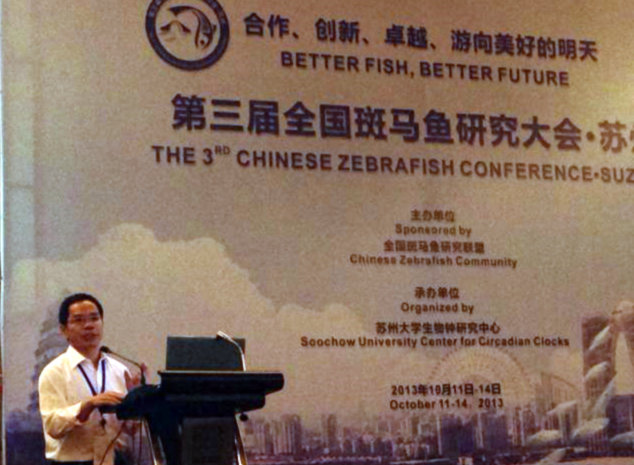 2013年(nián)10月11日至14日,第三屆全國(guó)斑馬魚研究大會在蘇州舉行(xíng),本次大會由全國(guó)斑馬魚研究聯盟主辦,蘇州大學(xué)生物鍾研究中心承辦,通過三年(nián)的(de)創新和(hé)發展,“合作、創新、卓越、遊向美好的(de)明天”成為(wèi)這次大會的(de)主題,孟安明、朱作言、林碩、溫子(zǐ)龍、彭金榮、羅淩飛(fēi)、鍾濤,杜久林、莫顯明、張博、張建、熊敬維、劉峰、張文清、劉東、孫永華、石德利、王晗、Alex Shier(Harvard University),Susan Mango(Harvard University),Koichi Kawakami(NIG, Japan)等有(yǒu)來自(zì)中國(guó)大陸、台灣和(hé)香港、美國(guó)、日本等地(dì)的(de)科(kē)學(xué)家及相關科(kē)研人員近500餘人參會。大會共設立特邀報告6個、大會報告18個、分會報告36個、牆報121個。與會人員分别從早期發育、器官發育、血液及基因組、進化、心血管發育、神經及行(xíng)為(wèi)、信号轉導、疾病與基因調控等方面研讨了國(guó)內(nèi)斑馬魚研究領域的(de)最新進展。