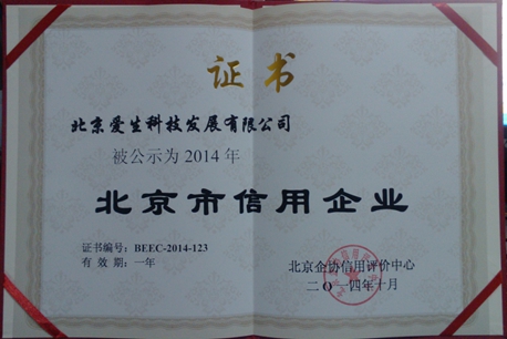 近日,公司接北(běi)京市(shì)企業信用評價協通知,在2014年(nián)10月份北(běi)京市(shì)年(nián)度信用企業評比中,我公司被初評為(wèi)2014年(nián)度“北(běi)京市(shì)信用企業”并通過了公示和(hé)最終認定。随後,于11月15日獲得了北(běi)京市(shì)質量評價中心頒發的(de)2014年(nián)度“北(běi)京市(shì)信用企業”證書。至此,我公司已連續超過三年(nián)被認定為(wèi)北(běi)京市(shì)年(nián)度信用企業。良好的(de)信用記錄,是公司良好形象的(de)表現,未來愛生科(kē)技也将始終秉承信用企業的(de)理(lǐ)念,以誠信和(hé)信用赢得更加美好的(de)未來。